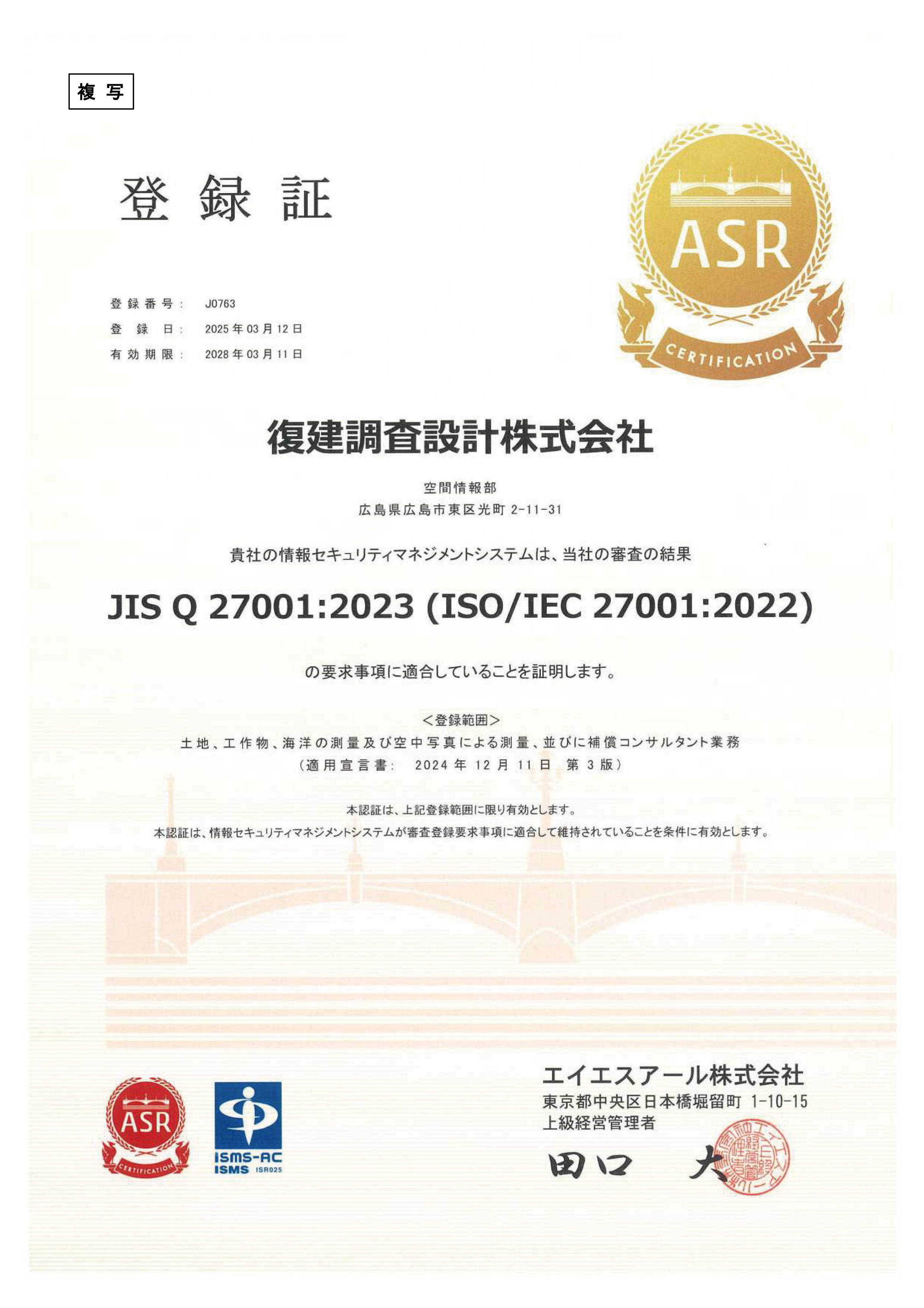 ・認証範囲: 土地、工作物、海洋の測量及び空中写真による測量、並びに補償コンサルタント業務