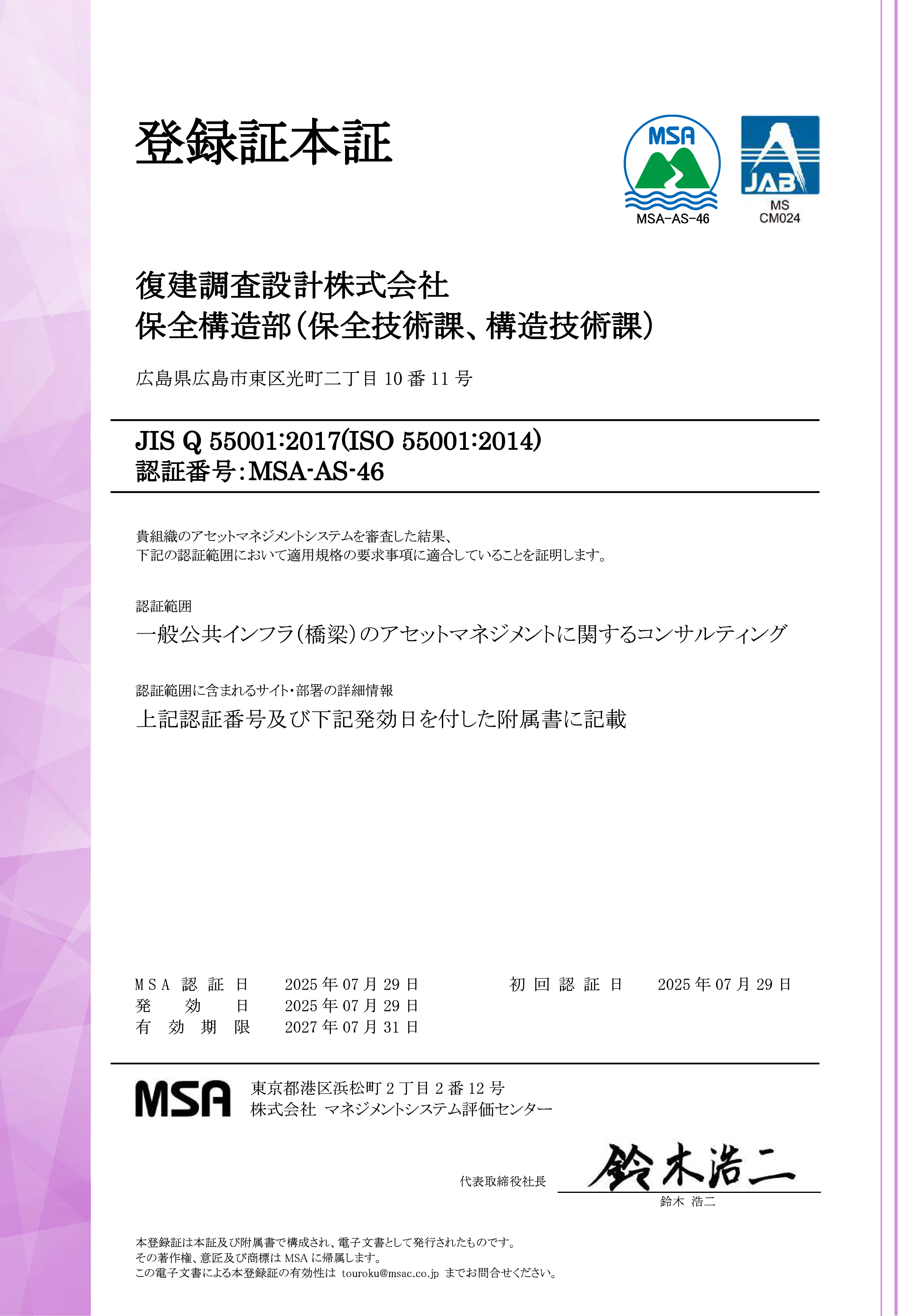 ・認証範囲:一般公共インフラ(橋梁)のアセットマネジメントに関するコンサルティング