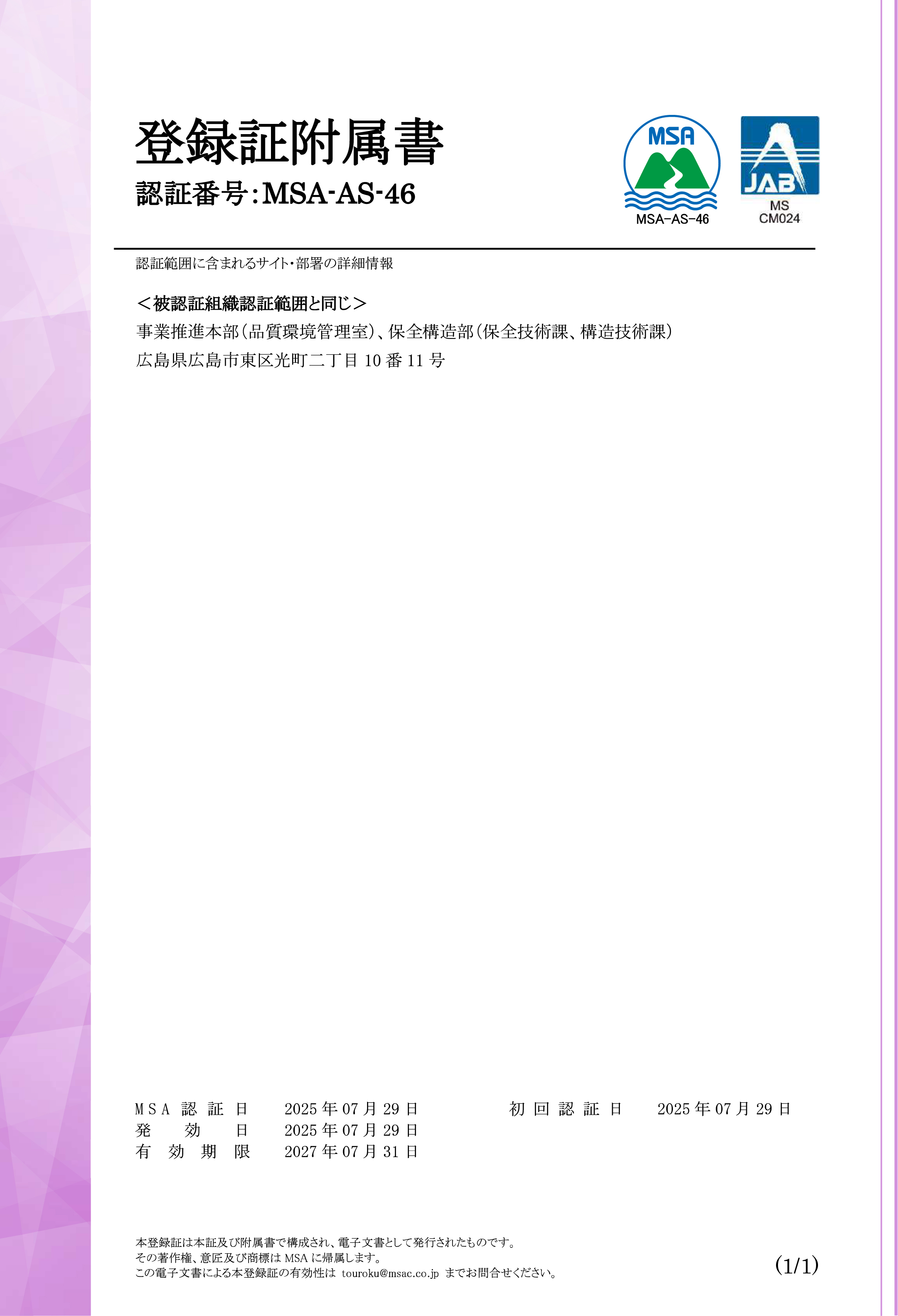 ・認証機関: 株式会社マネジメントシステム評価センター(MSA)