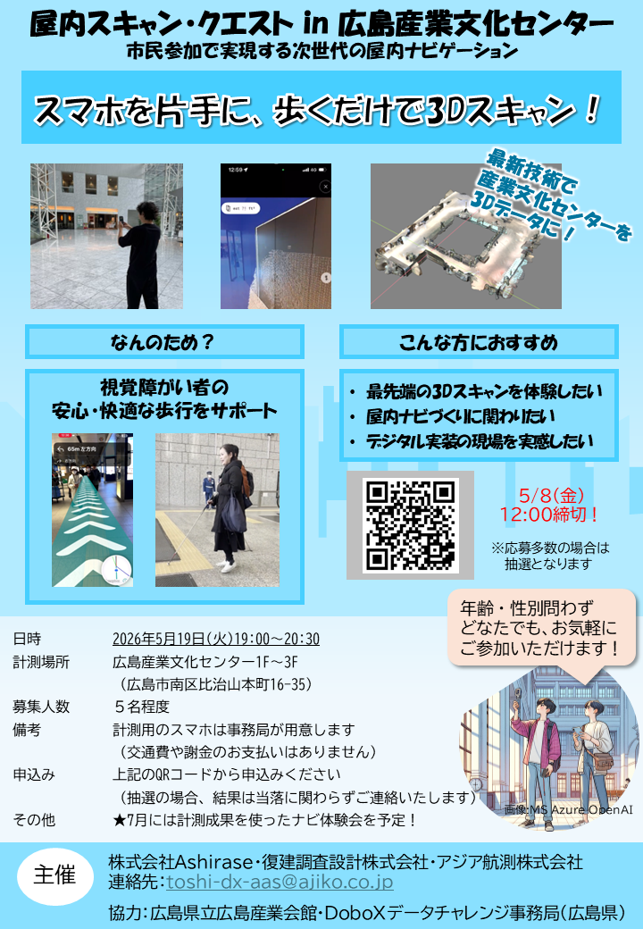 復建調査設計株式会社(本社:広島県広島市、代表取締役社長:藤井照久、以下「復建調査設計」)は、株式会社Ashirase(本社:東京都千代田区、代表取締役CEO:千野歩、以下「Ashirase」)、アジア航測株式会社(本社:東京都新宿区、代表取締役社長:畠山仁、以下「アジア航測」)と共同で、視覚に障がいのある方にも利用しやすい屋外と屋内のシームレスなナビゲーションの社会実装を目指し、「屋内スキャン・クエスト in 広島 ~視覚障がい者のためのシームレス歩行ナビを実現しよう~」第1弾イベントを開催します。