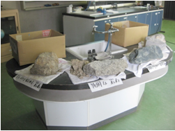 土が地面の深いところで固まった硬い石や、石が地面の浅いところでぼろぼろになった石を、ハンマーでたたいて比較