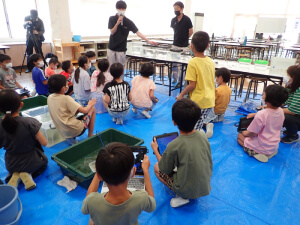 環境学習では弊社社員(竹下邦明、川本ひかる、杉山和哉)が講師を務め、事前に捕獲した魚に触れてもらったり、ザリガニ釣りを体験してもらったりと、児童の皆さんには大いに盛り上がっていただきました。